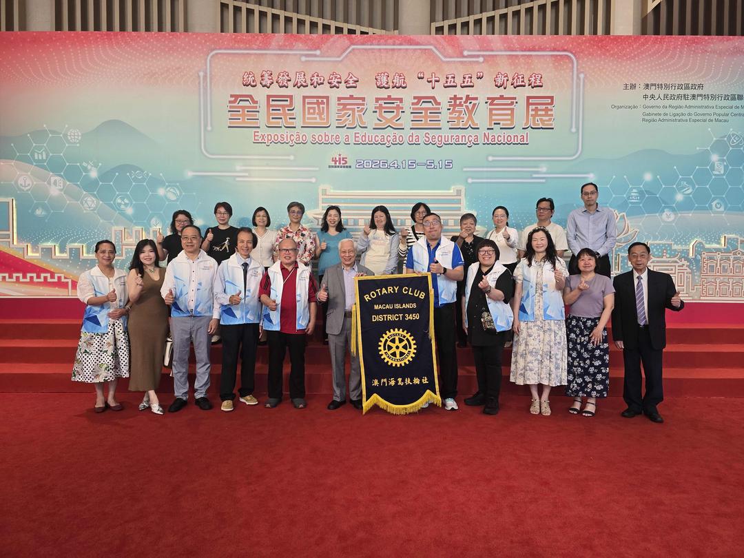 2026年4月19日,澳門海島扶輪社組織社友代表,走進位於中國與葡語國家商貿合作服務平台綜合體的「2026澳門全民國家安全教育展」,開展主題參觀學習活動,並在展覽留言冊題下「功在千秋,利在萬民」,以莊重題辭傳遞對維護國家安全、守護澳門繁榮的深刻認同。